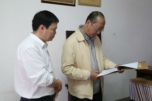 图为张辅军院长陪同江岸区法院院长陈力参观档案室