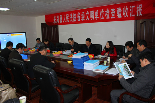 考核组一行到来凤法院召开座谈会,听取我院党组副书记、副院长张伟的工作汇报并收看《来凤法院省级文明单位创建工作纪实》专题片,实地查看了机关环境卫生、档案室和文化长廊等基础设施,详细查看了创建工作档案材料,对我院创建省级文明单位工作所取得的成绩给予充分肯定。