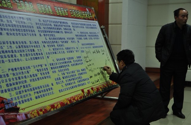 全院干警共同签署承诺书,承诺将严格按照“正风肃纪、惩恶扬善、强基固本”三项活动要求,内容包括:严格遵守最高法院各项禁令;严格审判质量管理,提高办案质量和效率;严厉打击各类严重的刑事犯罪,加大调解力度,缓和社会矛盾;规范执行行为,加大执行和解力度,切实缓解“执行难”;开展院长大接访活动,全面做好涉诉信访工作;坚持司法为民,绝不吃拿卡要,其中对于事关企业和民生的问题,县法院郑重承诺,全面落实服务企业营造公正安全发展环境12条实施意见,依法调解民商事纠纷,对涉企案件和事关民生的案件开辟“绿色通道”,优先立案、优先审理、优先执行,为来凤经济发展提供强有力的司法保障。